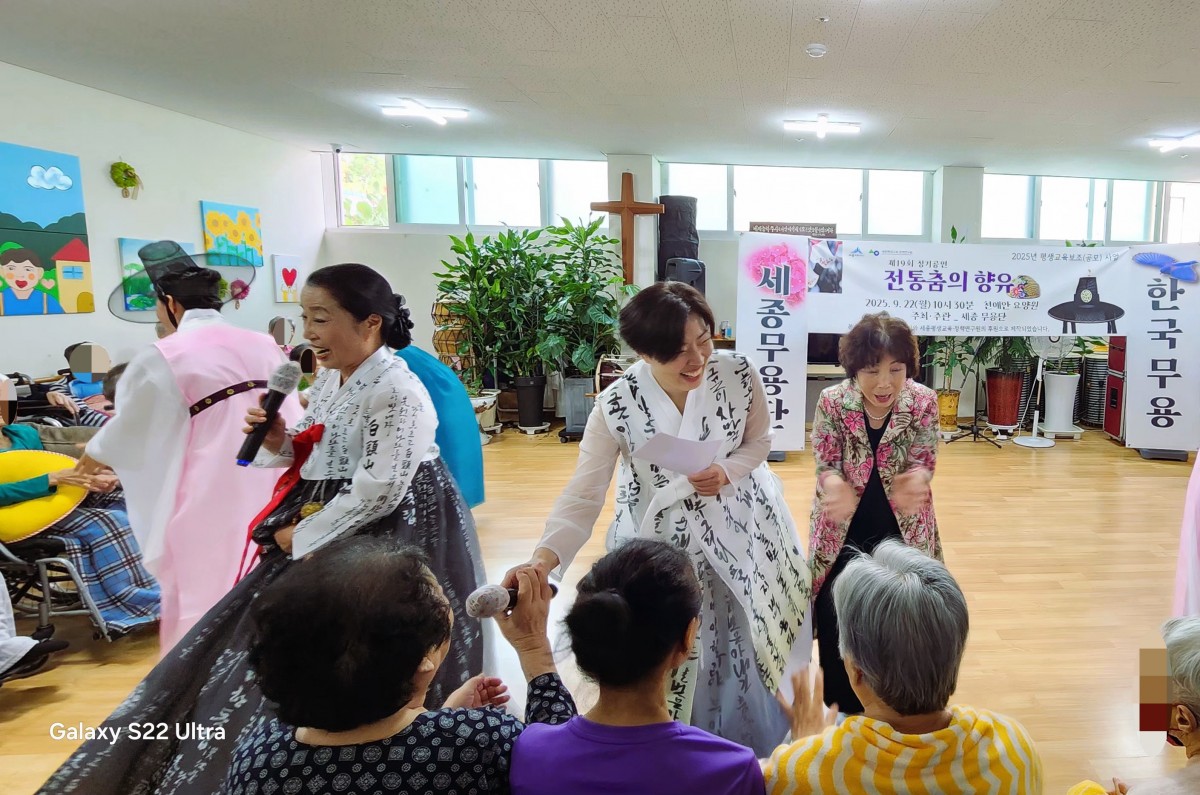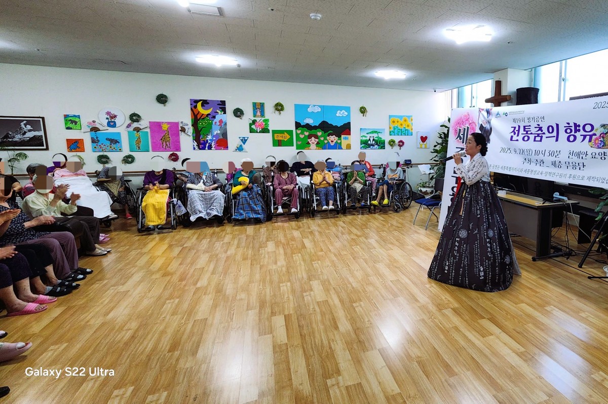 전통춤의 향유 관리자 0 2025년 9월 22일 월요일오늘 세종 무용단에서 주최 및 주관하는 '전통춤의 향유' 공연이 있었습니다.공연은 전통춤 뿐만 아니라 경기민요 노래가 포함되어 있었고 어르신들께서는 활짝 웃으시면서 즐겁게 관람하셨습니다.세종 무용단 단원들은 공연 내내 어르신들과 웃고 손을 잡아 드리면서 오늘 오전을 웃음으로 가득 차게 만들어 주셨습니다.